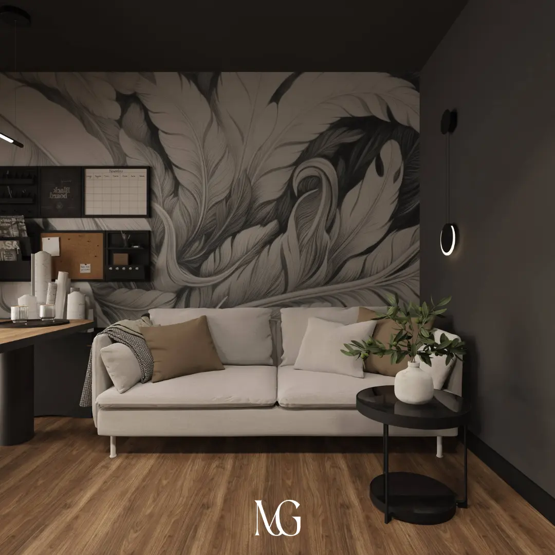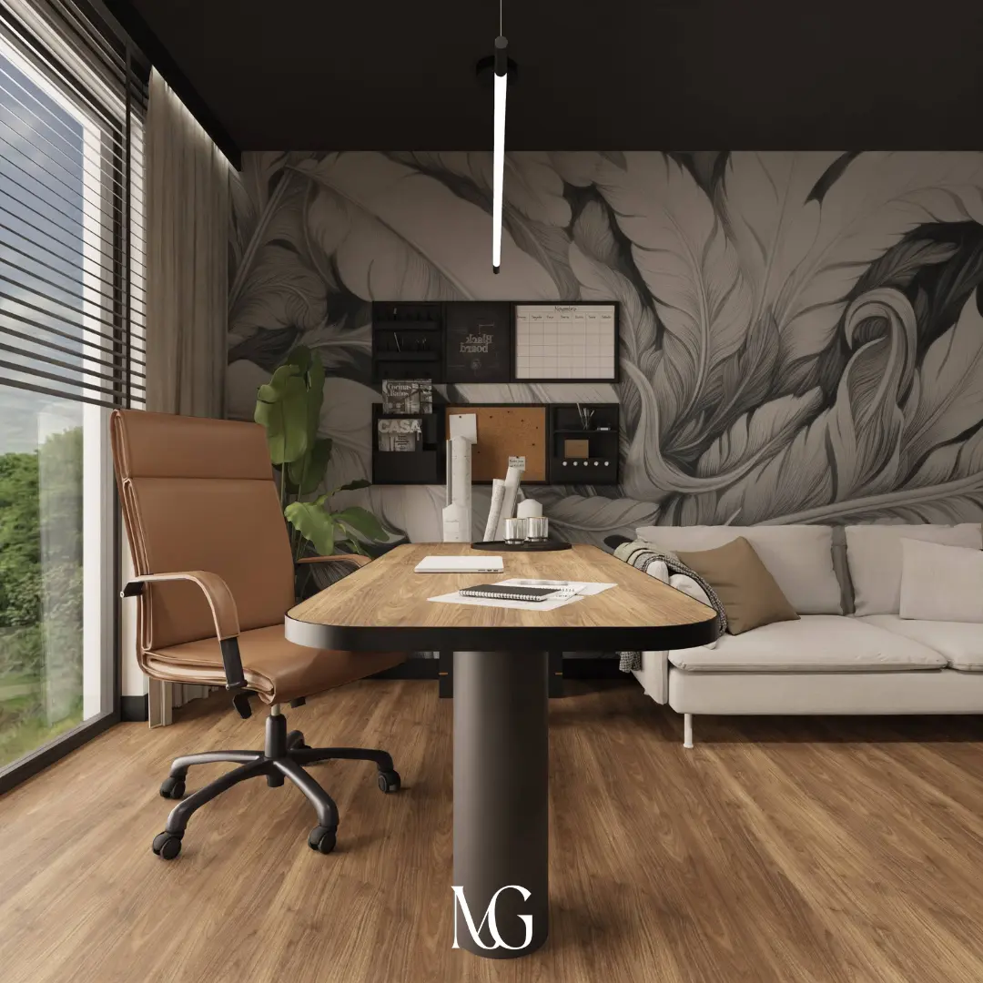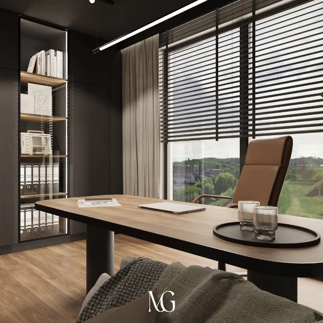 Przestrzeń, w której praca staje się przyjemnością. Ciemna, zdecydowana, z akcentami przytulności.