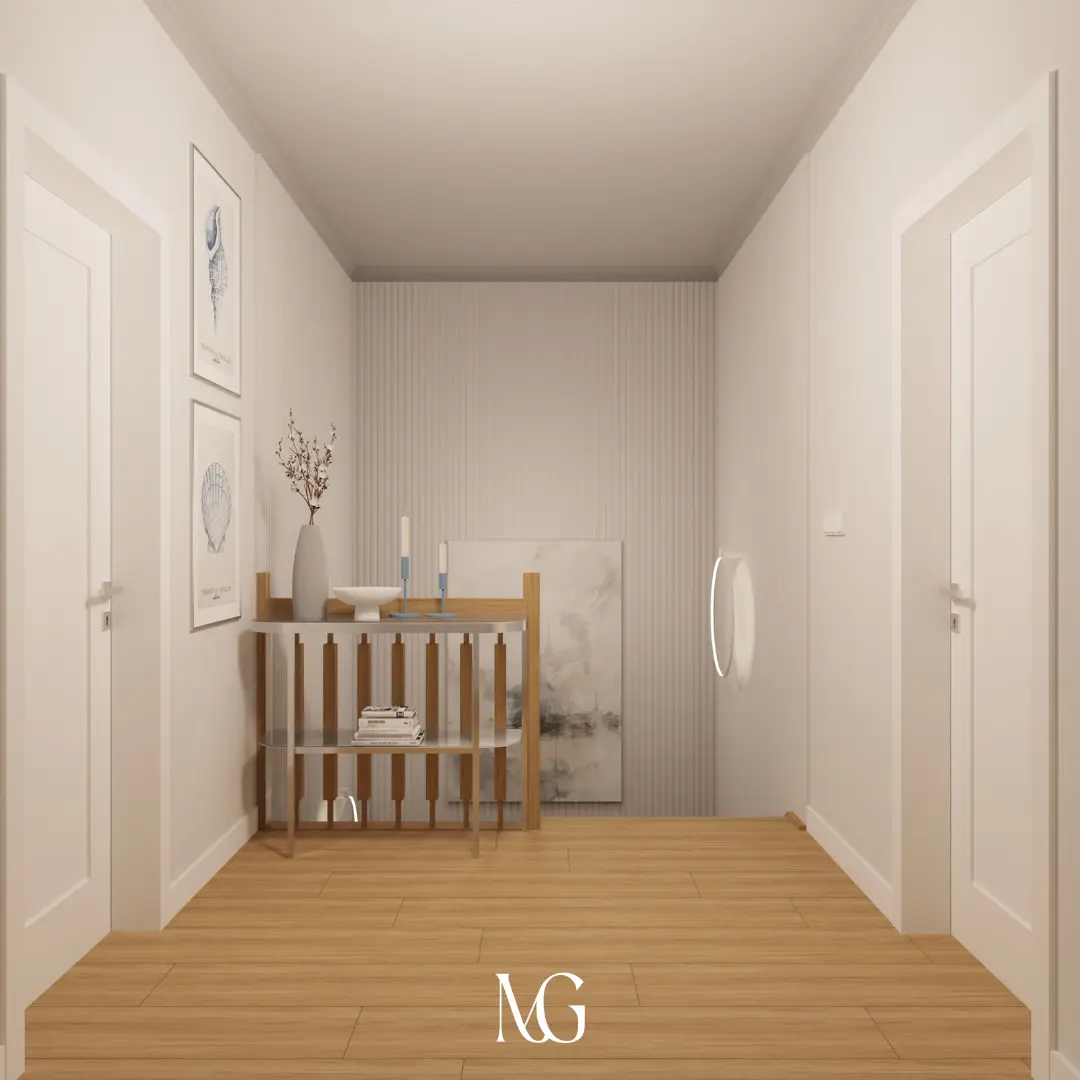 Sufit w kolorze gołębim nadaje charakteru, srebrne dodatki potraktowane jako biżuteria przestrzeni oraz drewno, które dodaje przytulności.