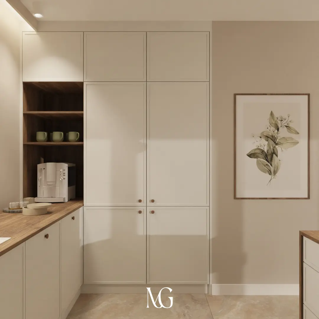 Zaprojektowana kuchnia, uwzględnia dużo przestrzeni roboczej, udało się wygospodarować miejsce na ekspres oraz filiżanki, aby mieć wszystko pod ręką!